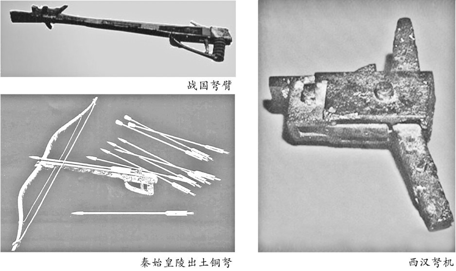 春秋时期国家比较多,大国崛起而兼并小国,到了战国时期,就剩下了所谓的战国七雄(图2.10)。这时期各国之间的无主荒地越来越少,各国相互接壤,战争目的从争霸逐渐变为兼并,战争形式也产生了相应的变化。首先,军队数量扩张,原来的贵族兵变成了大量平民兵。其次,军事行动范围不断扩大,并不是仅仅是约好了地方和时间进行战车的冲击而已,军队主要是由步兵和骑兵构成。原因在于:第一,战车比较昂贵,难以扩大军队规模,所以更多地通过增加步兵以扩军。第二,从战争方式来看,《孙膑兵法》曰“易则利车,险则利徒”,如果在比较开阔的平原地带打仗,车战比较方便,但是如果在险要的地方布阵、据守、伏击,就需要步兵进行野战和包围战。步骑兵替代了车阵,车的地位也逐渐下降,后来主要用于辎重运输。第三,新武器的发明,特别是弩的发明也对战车的衰落有重要的作用。图2.11中的三张图分别是战国弩臂、秦始皇陵出土铜弩和西汉的弩机。弩相对于弓来说,力量更大、射程更远、穿透力更强。更重要的,是弩可以延时发射,便于以更密集的射击对付战车。弩的发明和使用,加速了战车的衰落。