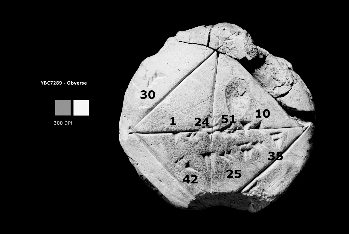 耶鲁大学收藏了大量的古巴比伦泥板,所有耶鲁大学收藏的泥板都采用YBC(Yale Babylonian Collection)作编号,其中编号为YBC 7289的泥板上以六十进制记载了单位正方形的对角线长