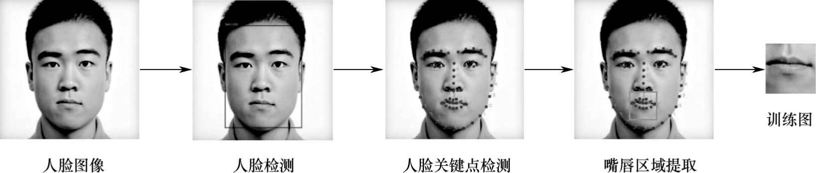 对于1.1节的图像识别任务来说,我们需要准备两类数据:一类是微笑的人脸,另一类是没有微笑的人脸。但实际上进行模型训练时,我们只需要关注嘴唇部位的状态就行,因此需要对收集的人脸图像进行预处理。图1.7所示是本次数据预处理的流程,包括人脸检测、人脸关键点检测、嘴唇区域提取等步骤。