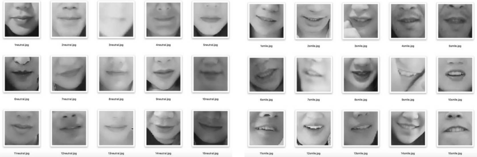 基于该流程,我们获得了一个基本的数据集,包含500张微笑表情的图片和500张非微笑表情的图片,存放在data目录下。图1.8中展示了一些非微笑表情样本与微笑表情样本。