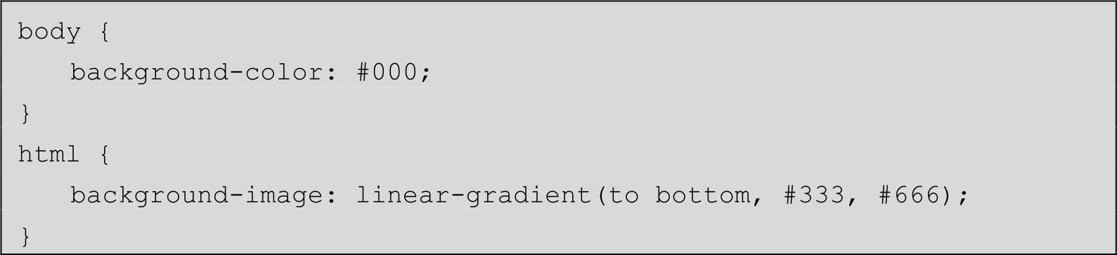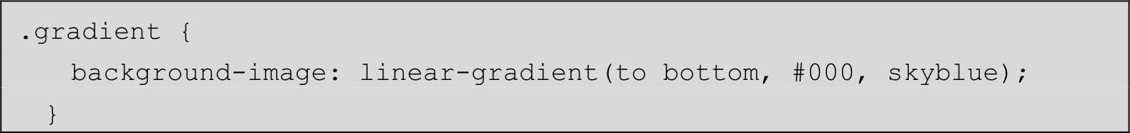 · 如果<body>元素直接设置线性渐变背景,则最终的效果也是8px高的水平条纹,代码如下所示,最终渲染效果如图2-21所示,是黑色到天蓝色的8px高的水平条纹。