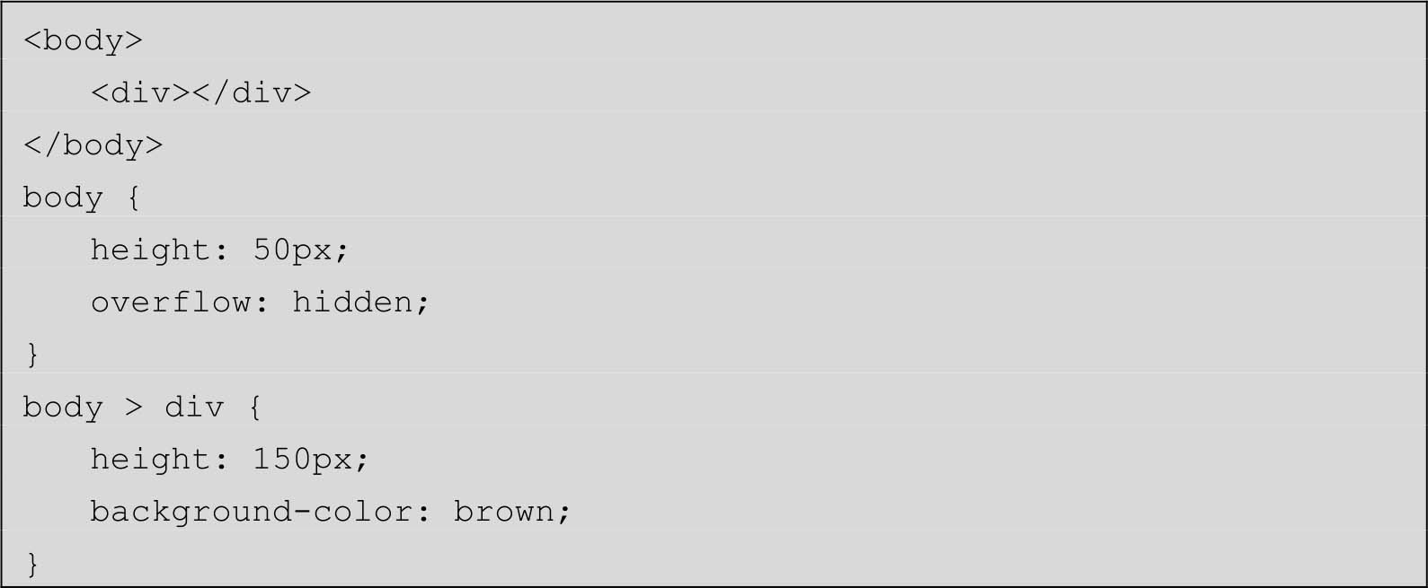 按照我们对现有知识的理解,<body>元素的高度只有50px,同时设置了尺寸溢出隐藏,那么里面的<div>子元素的150px高度应该只有50px的高度是可见的,但实际上overflow:hidden失效了,<div>元素并没有被隐藏。
