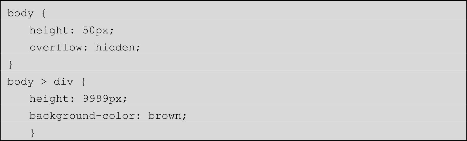 除背景之外,<body>元素的overflow属性也有类似的“冒泡”现象。举个例子,如下所示的HTML和CSS代码: