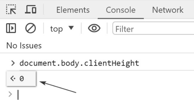新建一个空白页面,我们不设置任何额外的CSS代码,此时,我们使用如下所示的JavaScript代码去获取<body>元素的高度,返回的结果会是0,运行结果如图2-18所示。