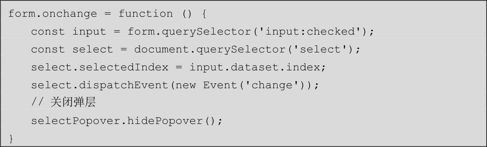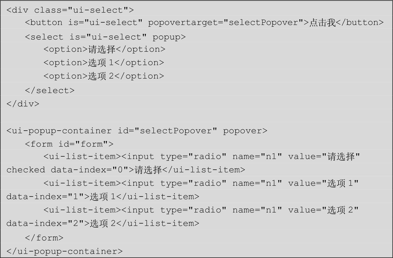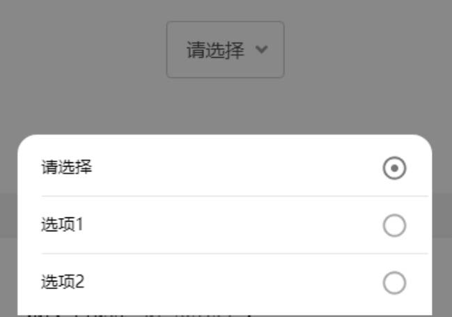 其中,上半部分HTML是原生下拉框,通过覆盖一个透明度为0的按钮来触发弹层的显示,下半部分则是弹层部分,使用radio类型的选择框模拟选择行为。