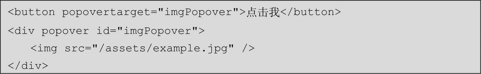 给需要弹出的元素设置popover属性,给触发显示的按钮元素设置popovertarget属性,其值等同于弹出元素的id属性值即可。