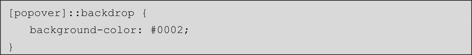 · popover弹层默认的模态背景是透明且可穿透的,如果希望有黑色半透明背景,则需要使用::backdrop伪元素自定义,例如: