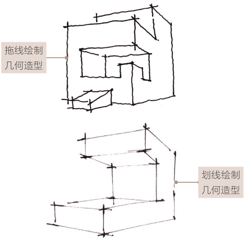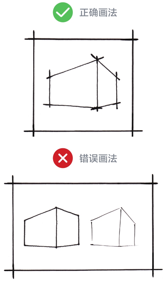 在空间结构的绘制中,体块角点是需要重点强调的部分。处理体块角点时,将各边线条大胆地画出头,可使结构更具冲击力,兼具较强的设计感。如果各边线条刚好衔接在角点,不越雷池半步,那么画面会显得过于拘谨、没有人情味;如果各边线条没有汇聚到角点,那么结构会显得粗糙、潦草。