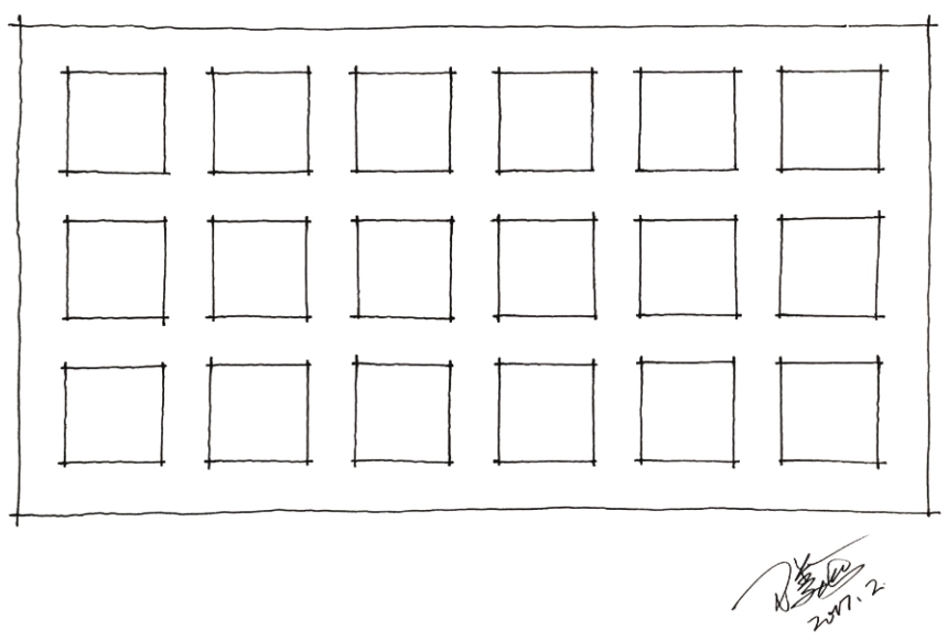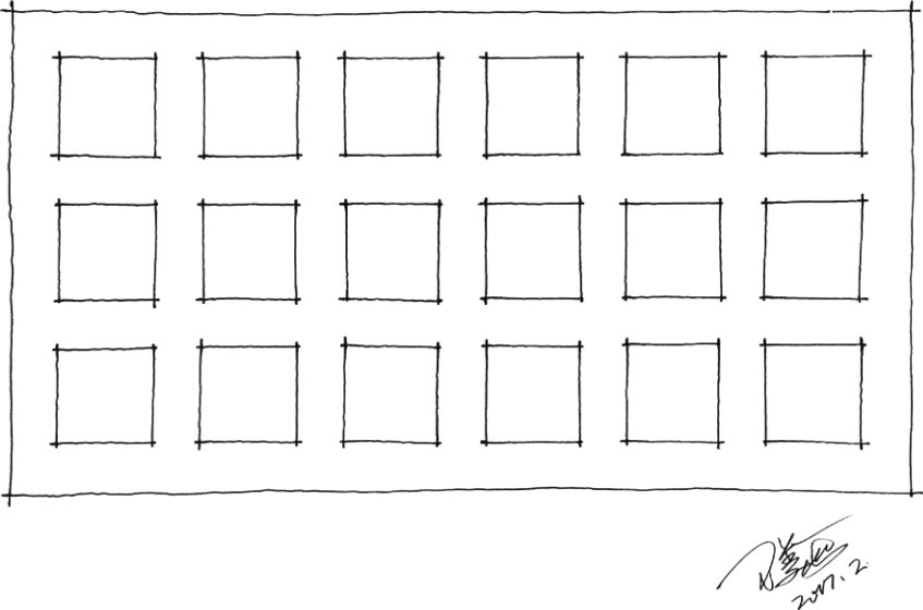 呈行列布置的大量正方形常用于表达形体重复排列的洞口结构,如窗洞口、窗棂格、打孔装饰板等,是环艺设计手绘中常见的结构线条。