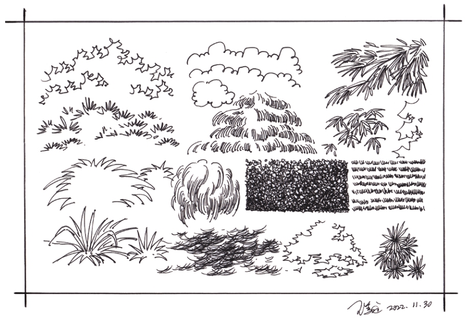 除了拖线与划线,环艺设计手绘线稿中还有一类专门用于绘制植物配景的线条,本书中称之为“树线”。树线的绘制,需要灵活运笔,形成自由、随意、不规则的线条,用于描绘植物的树冠轮廓或树叶的密集结构。