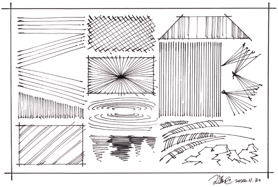 在环艺手绘中,排线是表达形体肌理、明暗、光影的必备手段,是塑造形体立体感的主要方法。