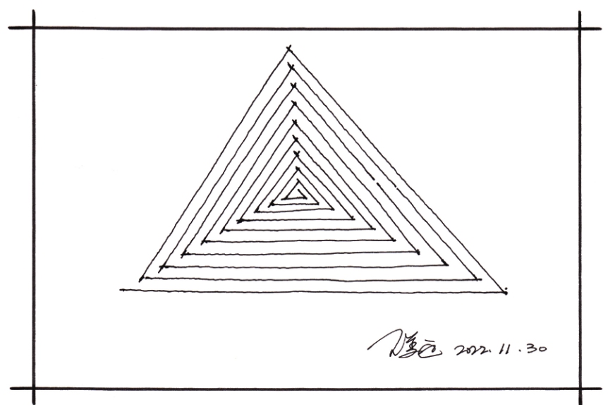 02 使用中性笔从左斜边出头的端点开始,画出三角形各边的平行线,逐步形成向外扩展的同心三角形。