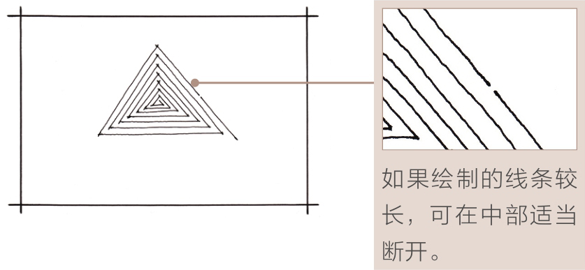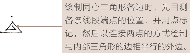 下面主要讲解多重同心三角形的手绘方法,重点训练徒手绘制平行线的控线能力。由于徒手划线绘制平行线难度较大,因此建议大家使用拖线的方式绘制。