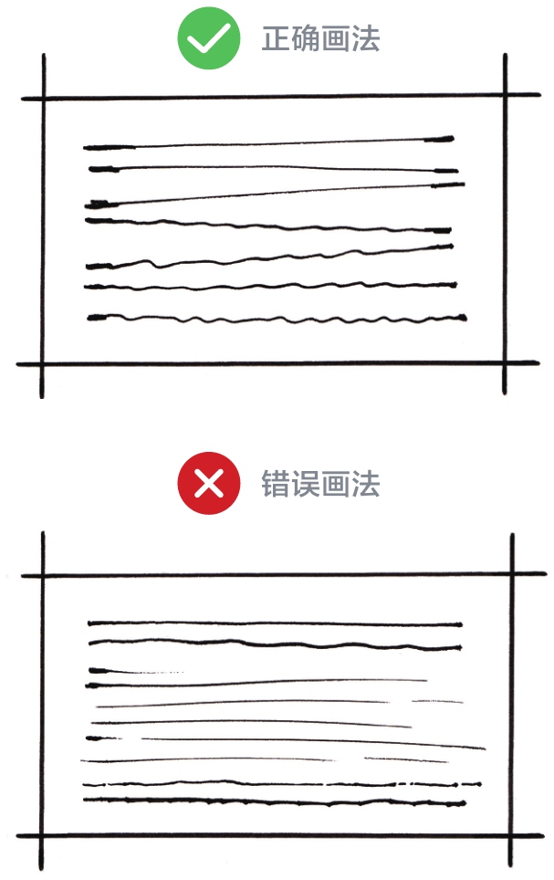③画线力求挺直,注意在起笔、收笔时要顿笔,过程中要放松,形成线条两端粗、中间细的力量感。