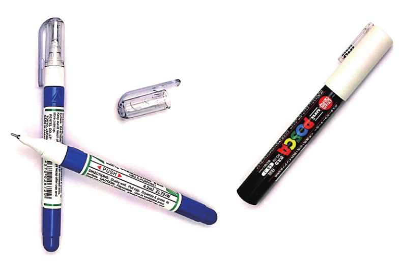 在手绘中,修正液和高光笔不仅是修改工具,还是重要的增效工具。修正液又称涂改液、立可白,是一种白色不透明速干颜料。它不仅可以用来修正画面,还适合为画面提亮高光、制作特效。然而,修正液在绘制长线、细线时会有一定难度,必要时需借助直尺来辅助绘制。高光笔的笔尖和一次性针管笔的笔尖相似,下笔流畅,可画细长线,在深色背景上,可以表现某些细节,但是其白色的浓度不如修正液的高,因此在提炼高亮度效果方面稍显不足。在手绘中,建议大家修正液和高光笔各准备一支,以便相互借助,取长补短。关于修正液,笔者常使用派通牌ZL72-W4.2ml手绘专用钢头修正液,高光笔则常用三菱POSCA白色补漆笔。