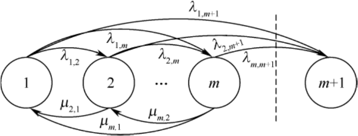 式中, T 为非吸收态{1,2,⋯, m } 的状态转移矩阵,是一个非奇异的方阵,由连续型马尔可夫过程的原理可知,其对角线元素均为负数,非对角线元素均为非负数; T 0 为非负列向量,是从任意状态到达 m +1状态的吸收概率(转移速率), Te + T 0 =0, e 是元素均为1的列向量。