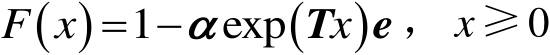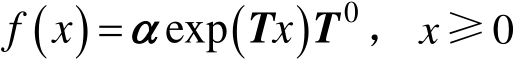 假设在[0,∞)上的连续分布是PH分布,以( α , T )的形式表示,其中 α 表示非常返状态的初始概率向量; T 表示非常返状态之间的转移概率矩阵,且 T 的维数表示该分布的阶数,PH分布的概率密度函数 f ( x )和累积概率函数 F ( x )为