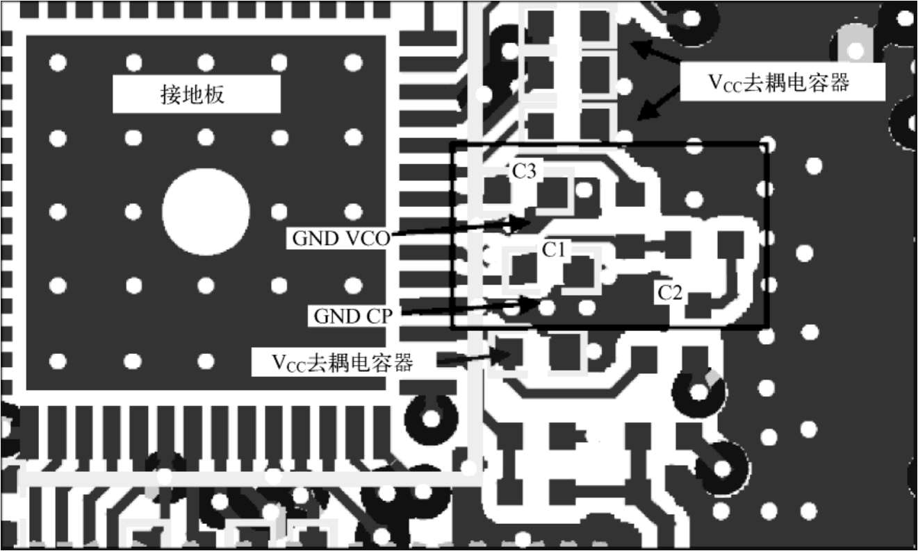 一个PLL滤波器的元器件布置和接地PCB布线示例如图3-23所示 [ 36 ] ,在接地焊盘上有许多接地过孔,允许每个VCC去耦电容有其独立的接地过孔。方框内的电路是PLL环路滤波器,第一个电容直接与GND_CP相连,第二个电容(与一个R串联)旋转180°,返回到相同的GND_CP,第三个电容与GND_VCO相连。这种接地方案可以获得较高的系统性能。