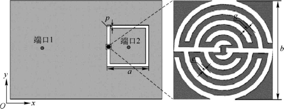 螺旋结构桥的宽度 b =2mm,螺旋臂宽度 g =0.1mm,螺旋臂间距 e =0.1mm。用以评估SSN抑制性能的端口1和端口2分别位于(15mm, 40mm)和(85mm, 40mm)处。