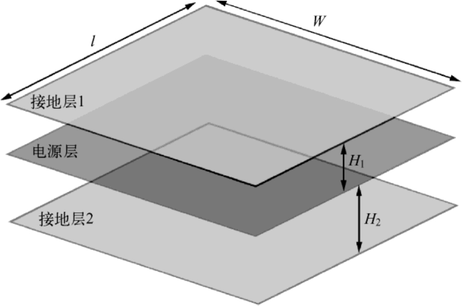 电源平面和接地平面结构是PDN功率传输性能最优良的部分,有效频率非常高。电源平面和接地平面的主要缺点就是表现为电磁谐振腔,谐振频率由平面面积和介质介电常数决定 [33,38] :