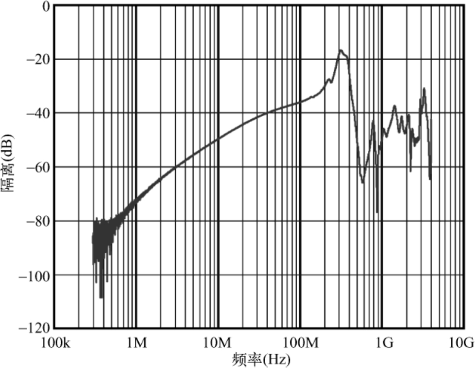 一些布局不可避免地具有重叠电路层,如图3-26所示。有些情况下,可能是敏感模拟层(如电源、接地或信号),下方的一层是高噪声数字层。层电容的存在往往会造成很大的问题。例如,在任一层注入信号,将该相邻层交叉耦合至频谱分析仪,耦合到相邻层的信号量 [37] 如图3-27所示。