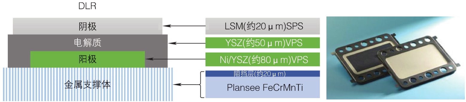 德国宇航中心(DLR)采用Plansee生产的FeCrMnTi作为金属支撑体制备高性能的MS-SOFC,在800℃条件下功率密度达到0.6W/cm 2 。DLR的MS-SOFC的技术路线如图2-5所示:首先在FeCrMnTi支撑体上制备一层阻挡层(钙钛矿约20μm),然后采用真空等离子喷涂方式依次制备多孔Ni/YSZ阳极功能层和致密YSZ电解质层,最后采用悬浮等离子喷涂(SPS)制备LSM阴极。
