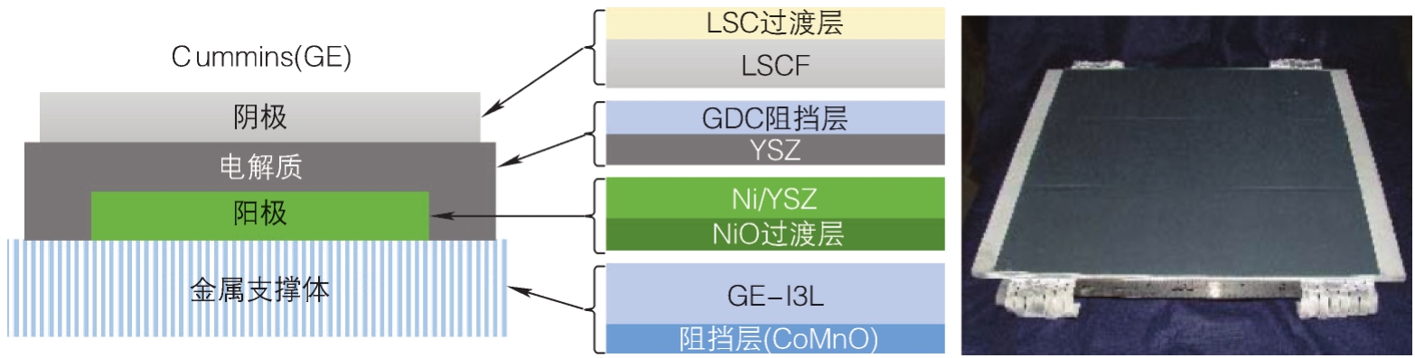 美国康明斯(Cummins acquired GE's technology)以等离子喷涂为主要加工方法制造MS-SOFC,开发了不同尺寸的单电池及千瓦级电堆,1kW电堆功率密度为0.2W/cm 2 。Cummins MS-SOFC的主要结构为:以GE-13L金属为支撑体,在阴极侧喷涂Co 1.5 Mn 1.5 O 4 防护涂层,以防止Cr扩散毒化阴极;在支撑体上分别制备NiO过渡层和Ni/YSZ阳极功能层,在阳极上制备致密的YSZ电解质薄膜,并在电解质上制备GDC阻挡层,阴极由LSCF功能层和LSC过渡层构成 [20] ,如图2-7所示。