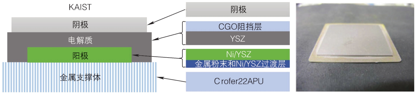 韩国科学技术高级研究院(KAIST)以Crofer22APU或SUS430为金属支撑体,采用烧结方式制备了5cm×5cm的高性能MS-SOFC,在800℃条件下功率密度达到0.5W/cm 2 ,主要结构及制作步骤如图2-2所示:在金属支撑体上依次制备过渡层(金属粉末+Ni/YSZ粉末)、阳极功能层(Ni/YSZ)、电解质薄膜(YSZ)后,在还原气氛下烧结成型,烧结温度大于1400℃。随后在烧结成型的半电池上依次制备阻挡层(Ce 0.9 Gd 0.1 O 1.9 )和阴极功能层,并在还原气氛下烧结 [11] ,完成MS-SOFC全电池的制备。