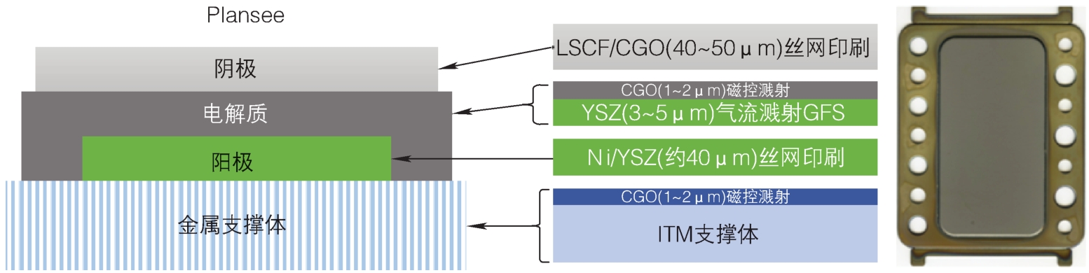 Plansee与德国于利希研究中心(Jülich)、卡尔斯鲁厄理工学院(KIT)和奥地利AVL等合作开发了高性能的MS-SOFC,在820℃条件下功率密度达到0.5W/cm 2 。Plansee MS-SOFC的技术路线如图2-4所示:采用磁控溅射方式在ITM支撑体上沉积CGO阻挡层(1~2μm),采用丝网印刷方式制备Ni/YSZ阳极功能层(40μm),采用气流溅射(GFS)方式制备YSZ薄膜电解质(3~5μm),采用磁控溅射方式制备CGO阻挡层(1~2μm),最后采用丝网印刷方式制备LSCF阴极功能层(40~50μm) [16-18] 。