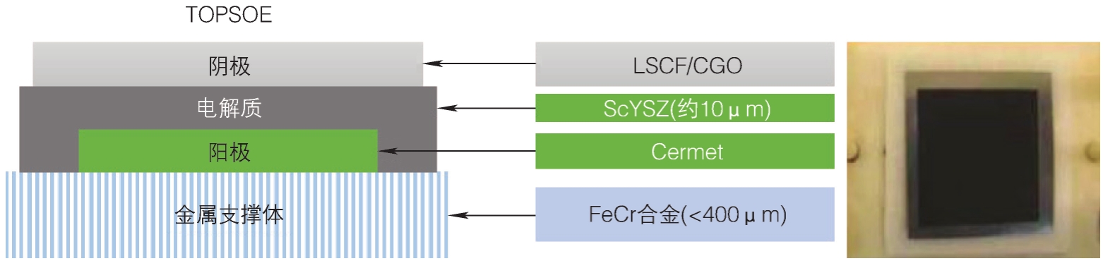 丹麦Topsoe采用FeCr合金作为支撑体制备了MS-SOFC,在650℃条件下功率密度达到0.4W/cm 2 ,其中金属支撑体厚度小于400μm,采用金属陶瓷制备阳极,采用钪掺杂的YSZ(ScYSZ)制备电解质(约10μm),采用LSCF/CGO制备阴极 [1,19] ,如图2-6所示。