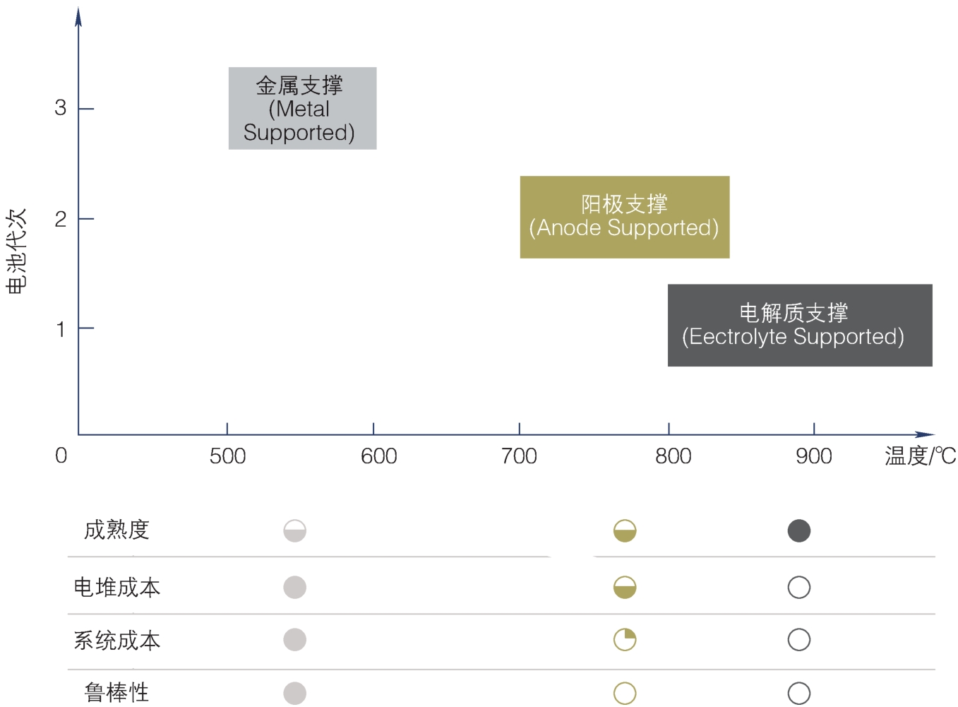 在众多公开报道中,将金属支撑SOFC定义为下一代固体氧化物燃料电池。如图2-1所示,从Ceres Power公开信息可看出,基于成熟度、电堆成本、系统成本、鲁棒性等综合指标评价,金属支撑SOFC具有明显优势。