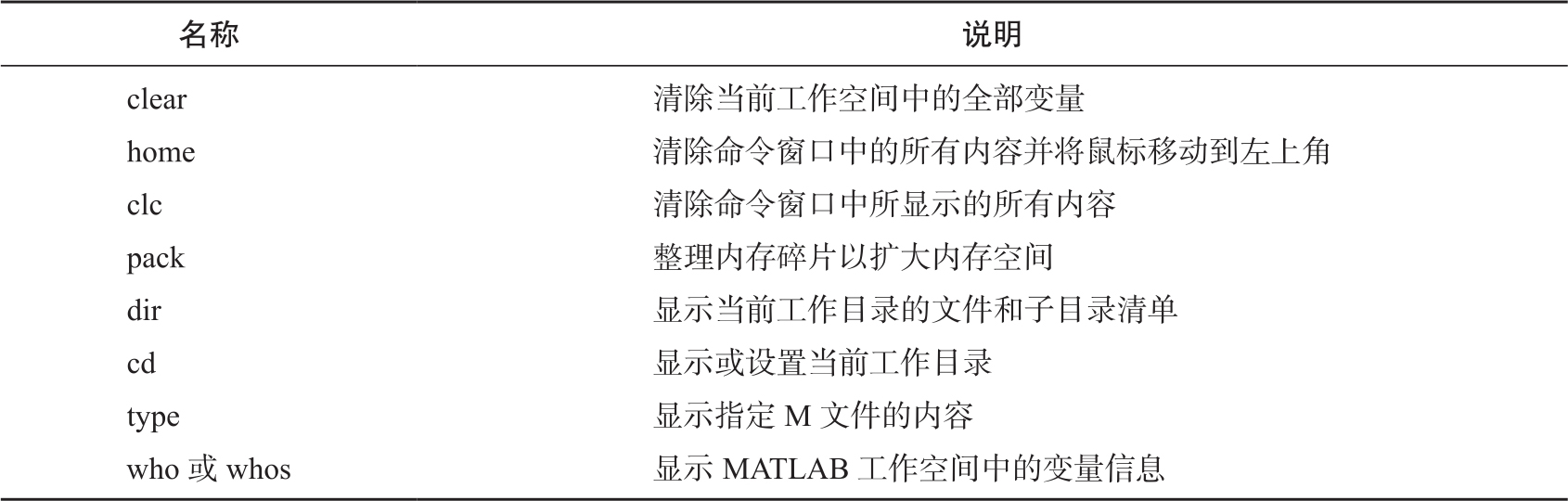 MATLAB命令行窗口中的“>>”为命令提示符,表示MATLAB处于准备状态。在命令提示符后输入命令并按下<Enter>键后,MATLAB就会解释执行所输入的命令,并在命令后面显示执行结果。常用命令见表1-1。