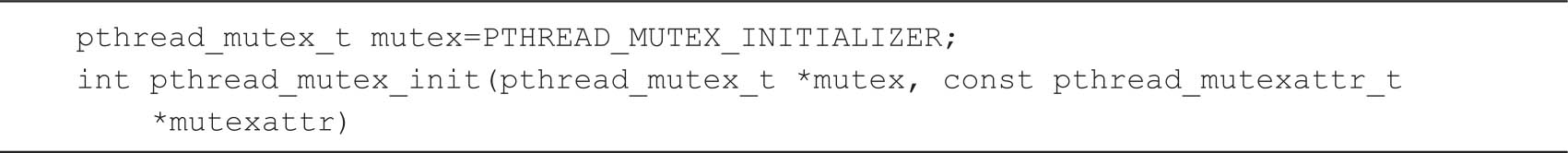 互斥量有两种创建方式:由静态变量分配与调用函数动态地创建。静态方式是POSIX定义了一个宏PTHREAD_MUTEX_INITIALIZER来静态初始化互斥锁;动态方式是采用pthread_mutex_init函数来初始化互斥锁。创建互斥量的方法如代码清单1-13所示。