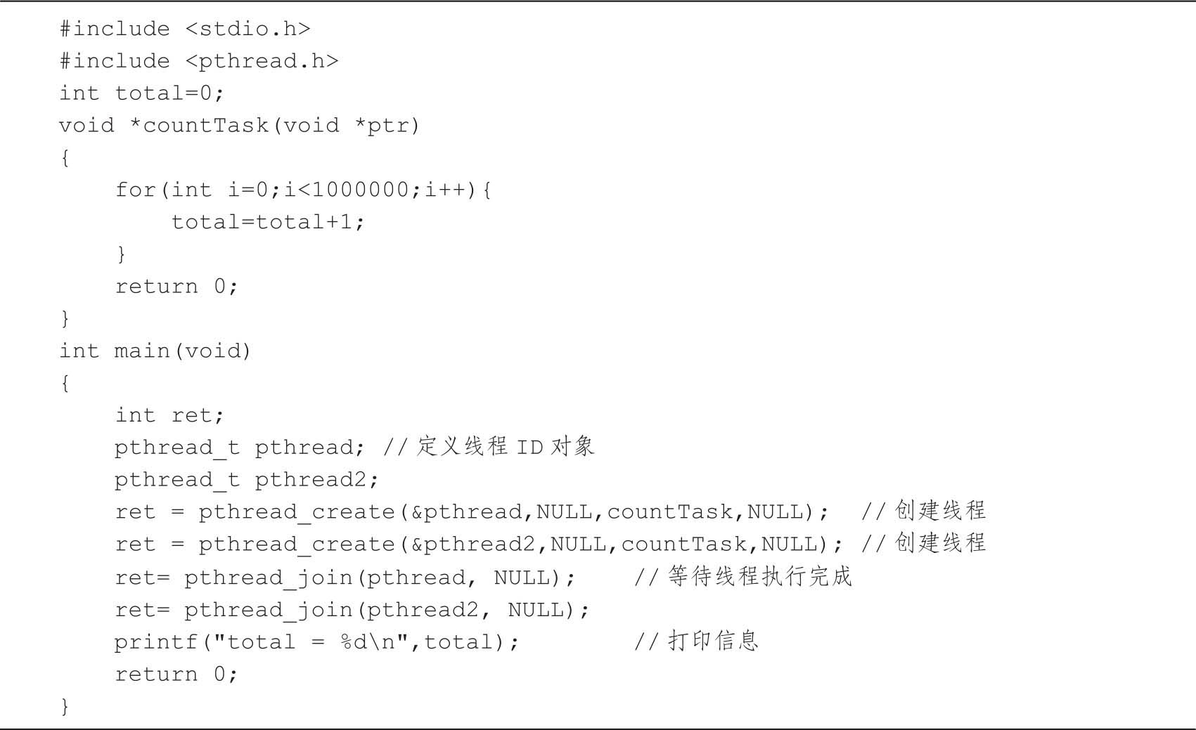 线程的主要优势在于能够通过全局变量来共享信息。不过这也带来一个问题:多个线程如何安全地修改同一变量?代码清单1-12是一个线程不安全的例子:先定义了countTask函数,函数的基本功能就是完成全局变量total的100万次自增。在main函数中创建了两个线程,同时完成对total的自增计算。