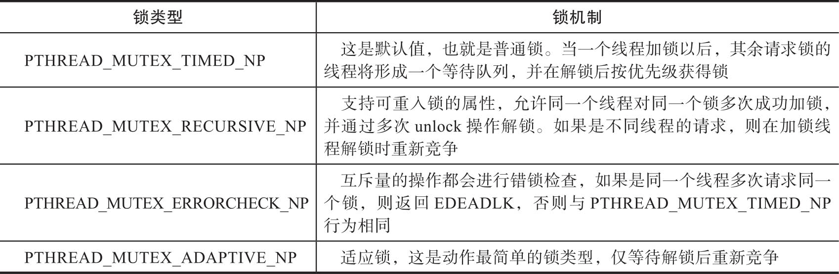 mutex为互斥量对象,mutexattr用于指定互斥锁属性,如果为NULL则使用默认属性。互斥锁的属性在创建锁的时候指定,在LinuxThreads实现中仅有一个锁类型属性,不同类型的锁在试图对已被锁定的互斥锁加锁时的表现不同。锁有4种类型,具体如表1-11所示。