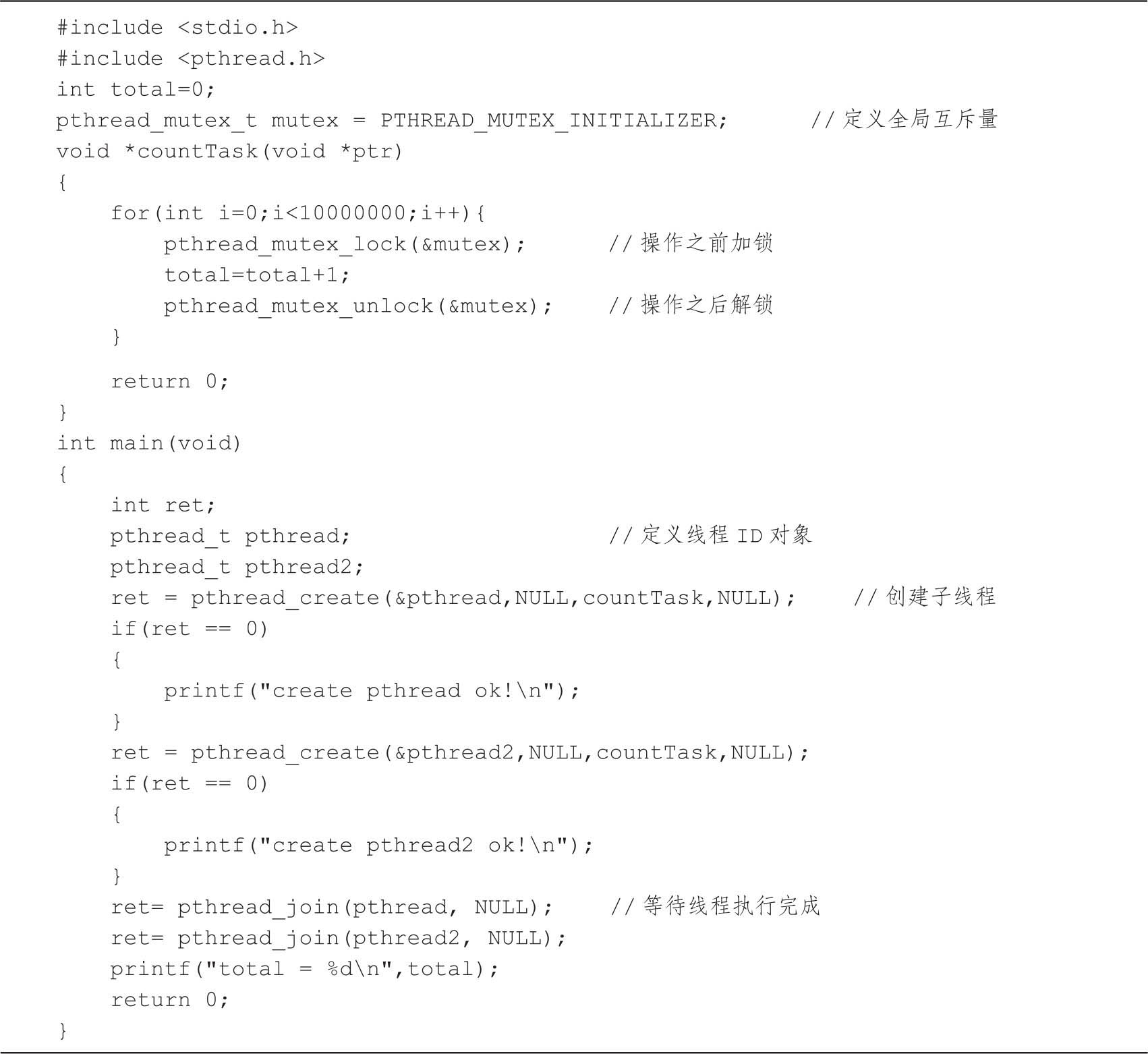 接下来对本章开头的用例稍微进行改造,改造结果如代码清单1-16所示。代码开头采用静态赋值的方式定义了mutex互斥变量。在对total值修改之前调用pthread_mutex_lock函数来获取锁,然后进行total值的修改,之后调用pthread_mutex_unlock函数来释放锁对象。