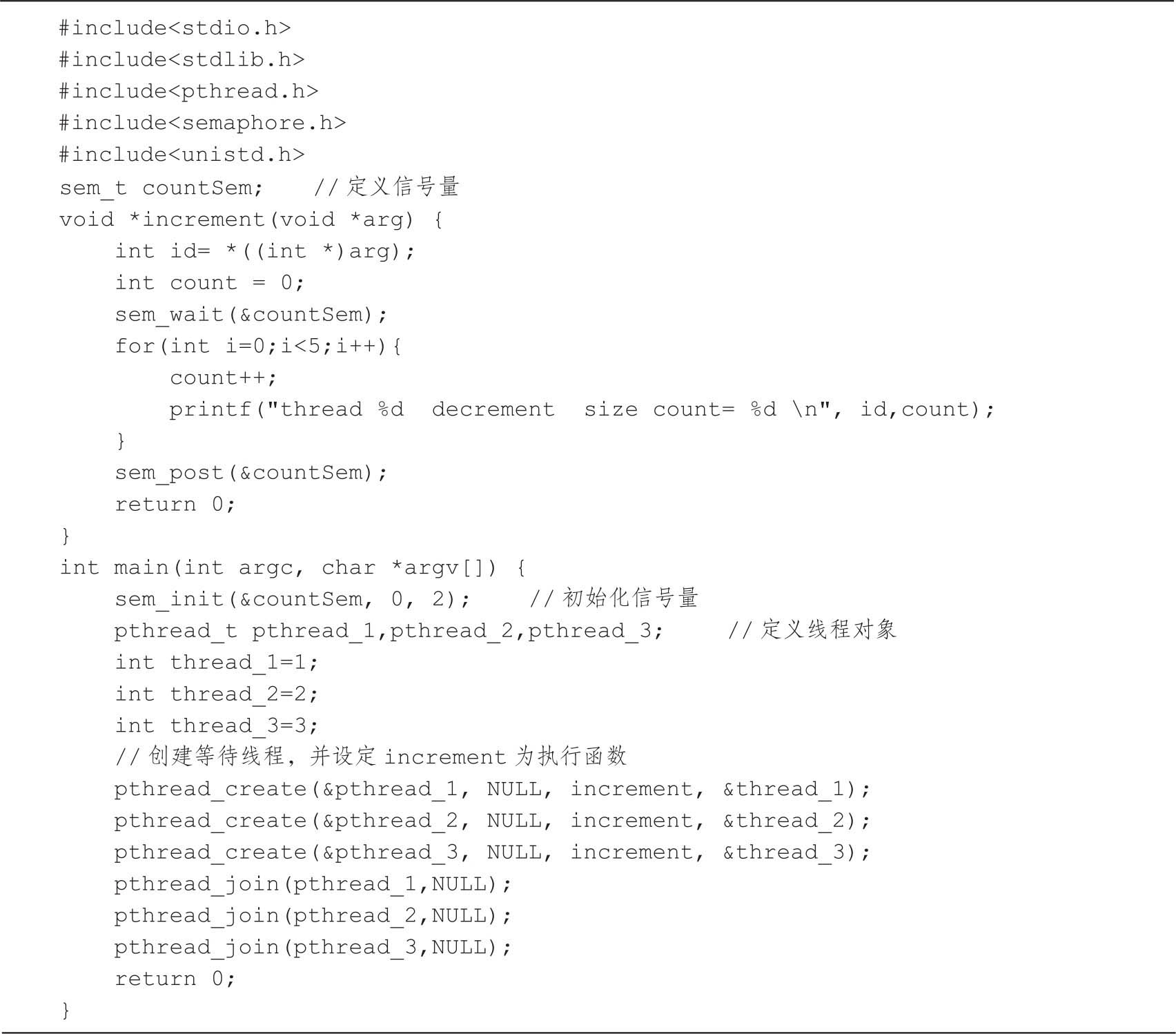 代码清单1-21是一个关于信号量使用的简单例子,首先定义了全局信号量countSem,用来进行并发线程的控制。然后定义了数据自增的函数increment,执行自增之前要获取countSem信号量,自增结束之后释放countSem信号量。
