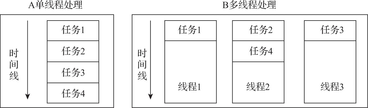 CPU执行指令与访问内存都比较快,一般耗时在ns级别,但访问的存储与网络设备都非常慢,耗时达到了ms级别。而在应用程序运行时,CPU除了进行运算与内存访问之外,更多是执行磁盘读写、网络访问等I/O操作,如果通过串行化执行应用程序会非常慢。例如,有个进程A需要完成4个任务:任务1是读写文件配置、任务2是打印日志,任务3是网络访问,任务4是显示当前进度。任务1、任务2、任务3都需要300ms,任务4需要200ms。如图3-2所示,如果采用单线程处理,整个任务运行的时长是300×3+200=1100ms,如果采用多线程处理,可以同时处理任务1、任务2、任务3,执行时长是300+200=500ms。