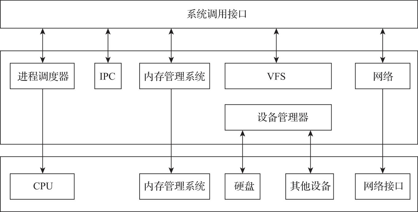 Linux内核的逻辑架构如图3-1所示。内存管理系统负责引导CPU完成内存数据的读写,虚拟文件系统负责引导CPU完成文件的读写,网络通信系统负责完成数据网络通信。