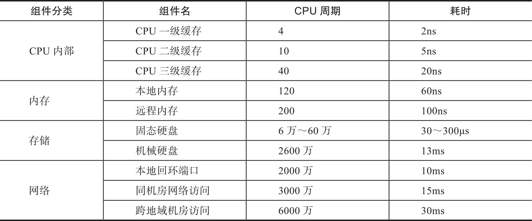 由于CPU制造技术越来越先进,其集成度越来越高,运行速度也越来越快,通常指令周期都能达到ns级别。最近20年,相比存储、网络等相关硬件设施在性能上的提升,CPU性能提升非常慢。另外,CPU在访问各个相关设备的时候有很大的差异。CPU访问各硬件的时间如表3-1所示。