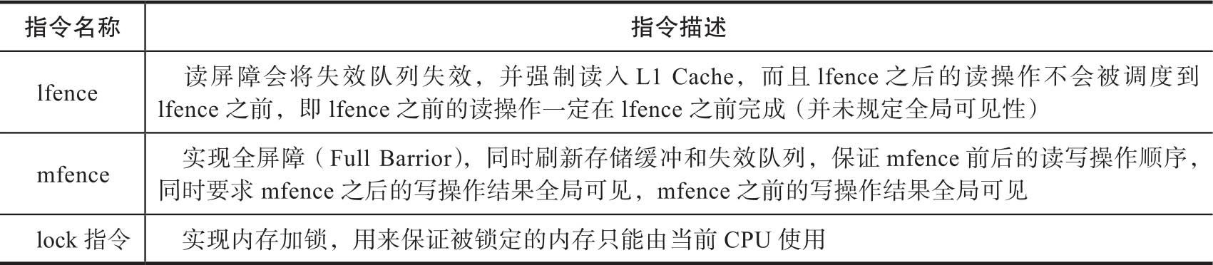 内存屏障需要和CPU缓存直接打交道,需要硬件CPU指令支持。不同的CPU处理器对内存屏障的支持指令也不相同。下面以Intel系列CPU来详细讲解内存屏障的实现方式。Intel处理器提供了4种内存屏障指令,详细信息如表3-7所示。