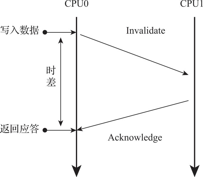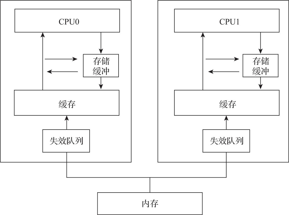 MESI协议虽然实现了CPU缓存之间的数据强一致协议,但也带来了重大的性能问题。如果严格遵循MESI协议,那么一个CPU修改数据时,其他CPU必须停下当前任务去处理缓存消息,这会大大降低CPU的运作效率。因此,在实际硬件实现上,工程师采用了弱一致性的方案,引入了异步处理的机制。在数据修改的时候采用存储缓冲(Store Buffer)机制,在数据失效时采用失效队列(Invalidate Queue)机制,如图3-16所示。