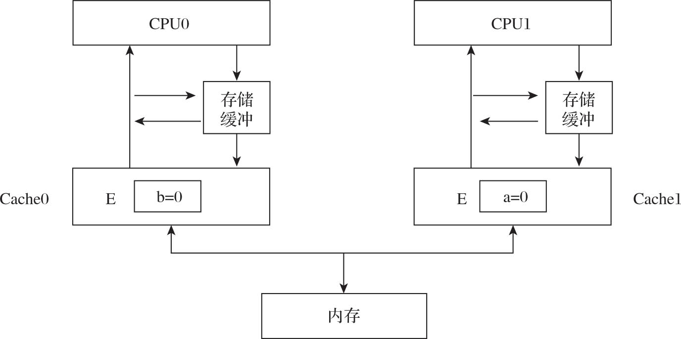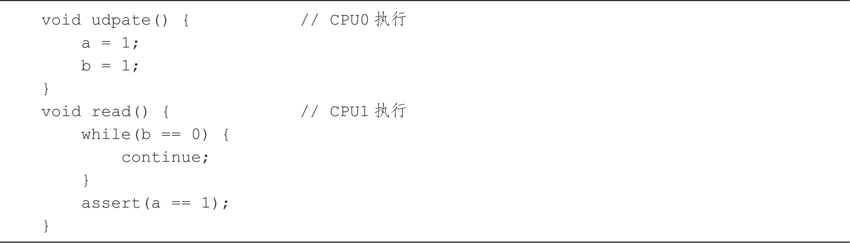 代码清单3-10是一个简单的例子,用来演示存储缓冲与失效队列带来的数据一致性问题。