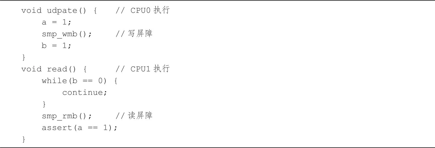 首先,我们对代码清单3-10例子中的代码稍作调整,如代码清单3-11所示。在a、b两行代码之间,增加一行内存写屏障的代码,确保CPU0的存储缓存中的消息能够及时传递到其他CPU。同时读取a之前也会加上一个内存读屏障,确保CPU1的失效队列中的消息能够被及时处理。