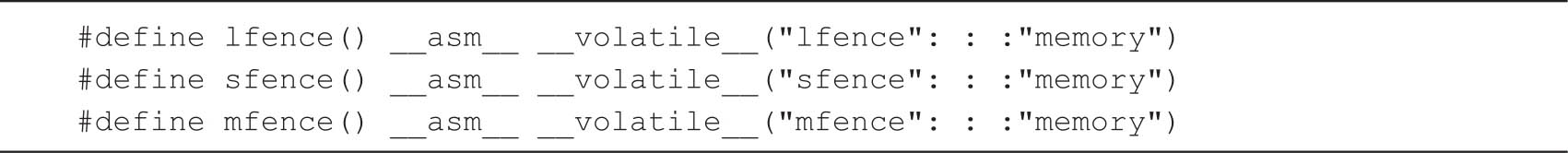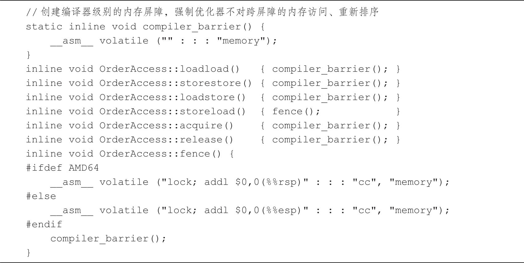 内存屏障在不同的操作系统与处理器上有不同的实现,以Linux x86处理器为例,具体实现如代码清单3-14所示。