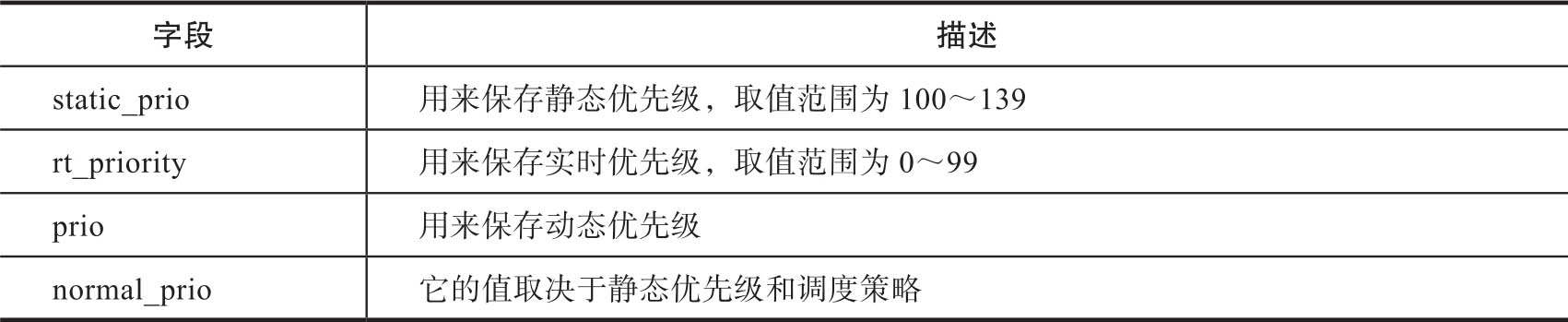 task_struct中有4个字段prio、static_prio、normal_prio、rt_priority来表示进程的优先级,详细信息如表1-3所示。