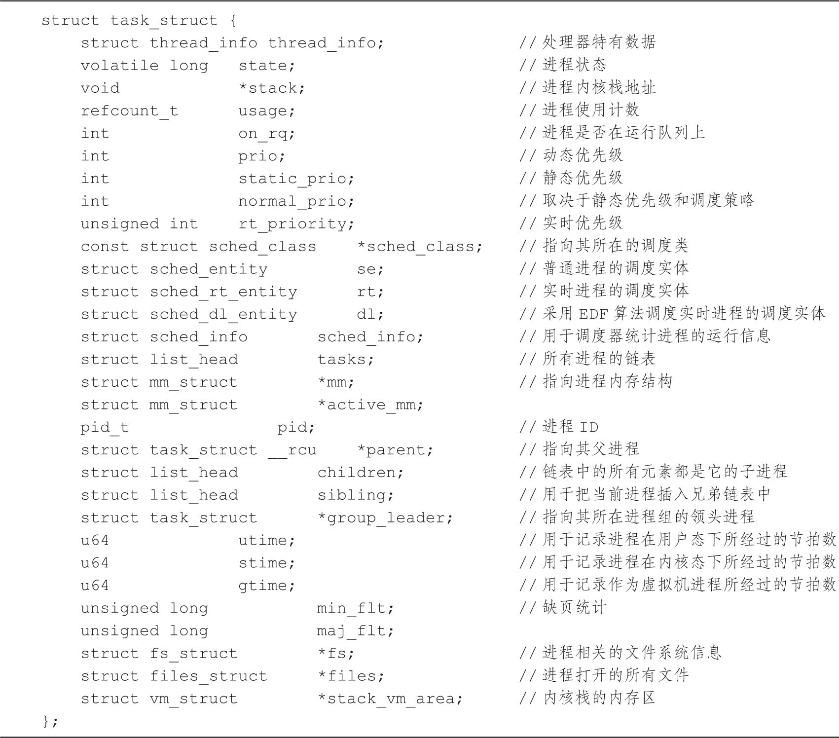 为了更好地管理进程,Linux制定了进程描述符(Process Descriptor)来详细地描述进程的状态和资源以及所做的事情。Linux的进程描述符是task_struct类型的数据结构,它详细描述了进程的所有信息。进程描述符的实现如代码清单1-1所示。