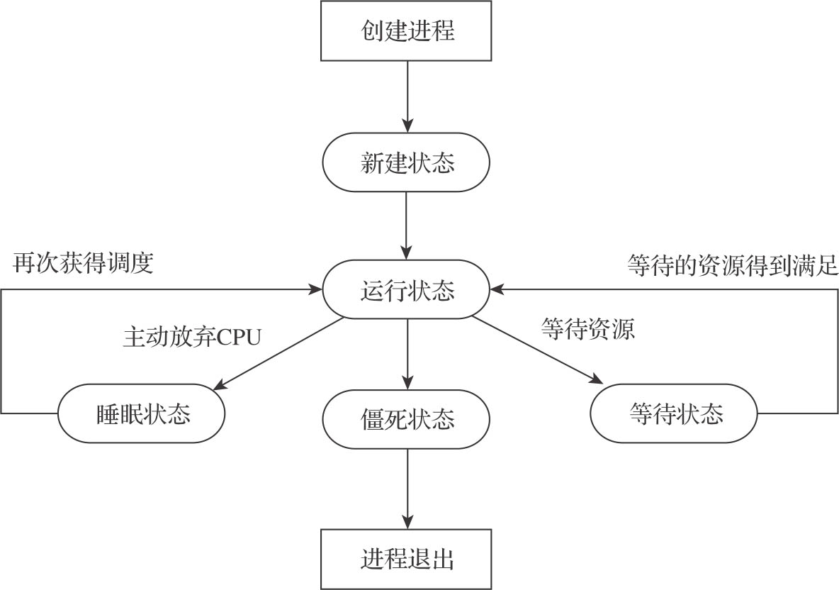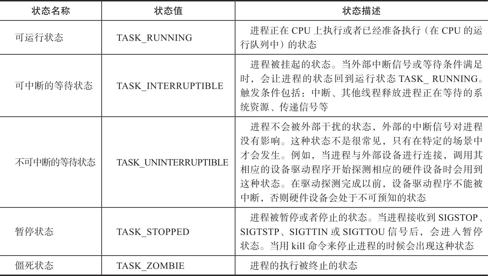 在上述代码中,state字段描述了当前进程或线程的状态信息,字段值描述了进程当前所处的状态。在当前的Linux系统中进程有如下状态:可运行状态、可中断的等待状态、不可中断的等待状态、暂停状态、僵死状态。详细进程状态描述如表1-1所示。