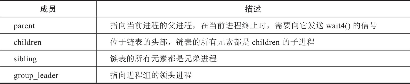 task_struct中定义了4个字段来表示进程之间的关联关系,详细信息如表1-2所示。