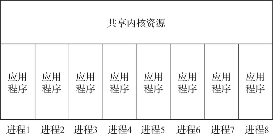 从进程视角来看 ,每个进程都有独立的内存地址空间。这个地址空间至少包括两部分内容:一部分是内核,另一部分是用户的应用程序。图1-1所示为进程结构示意图,图中有8个进程,每个进程拥有内存的整个虚拟地址空间。这个虚拟地址空间被分成了两部分:上半部分是所有进程都共享的内核资源,里面放着一份内核代码和数据;下半部分是应用程序,它们相互独立、互不干扰。